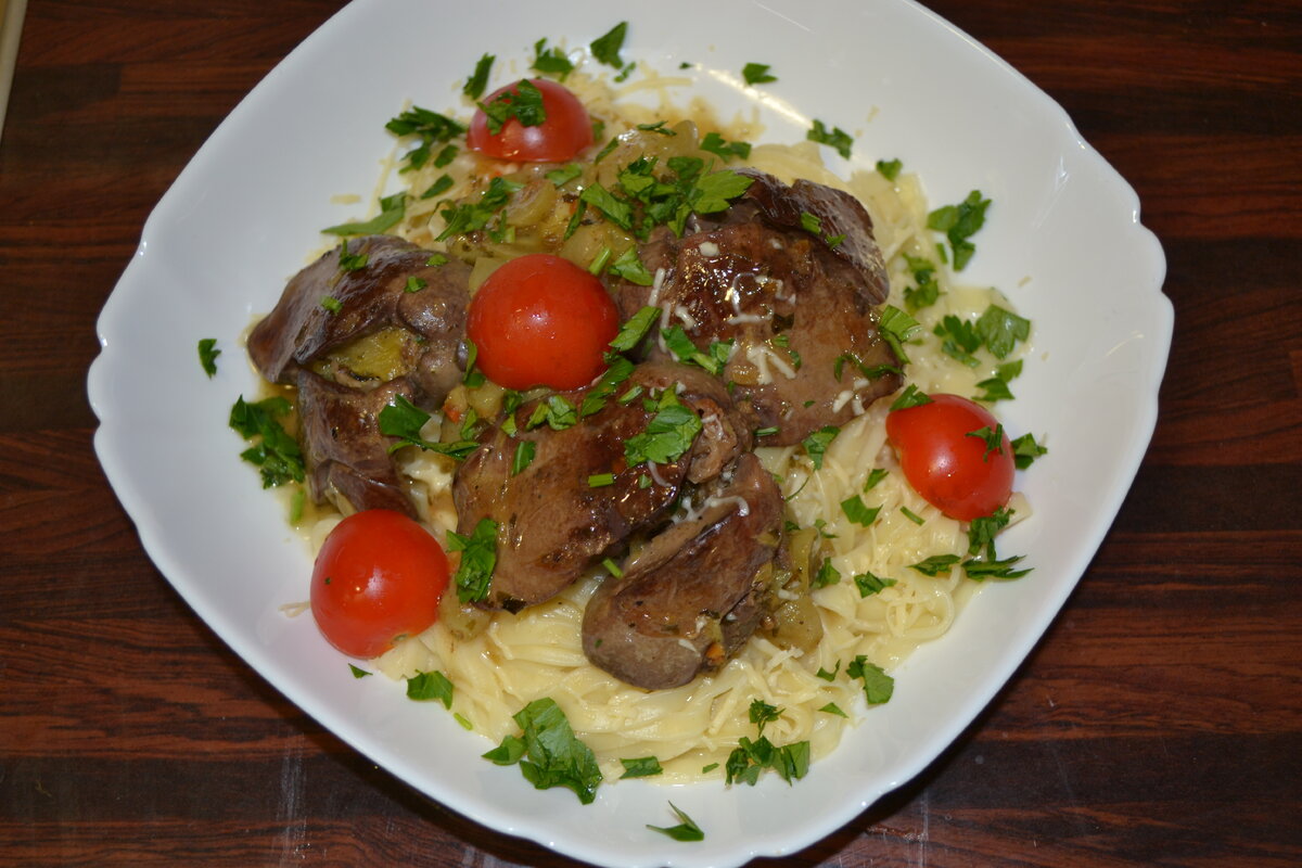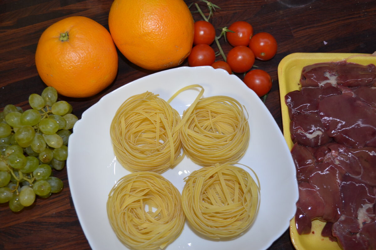 Ингредиенты · Печень гусиная – 400 гр · Виноград - 15-20 ягод · Апельсин – 1 шт · Белое вино – 50 гр · Соль · Перец · Зелень, помидорки черри – для украшения Приготовление 1. Солим и перчим печень и выкладываем на раскаленную сковородку. 2. Виноградинки режем на половинки и добавляем на сковородку к печени. 3. Выжимаем сок одного апельсина прямо на нашу печень на сковородке. 4. Добавляем на сковородку 50 гр белого вина. 5. Обжариваем буквально 2- 3 минуты и подаем. 6. Подать можно с любым гарниром на ваш вкус. 7. При подаче украшаем помидорками черри и зеленью. Приятного аппетита!