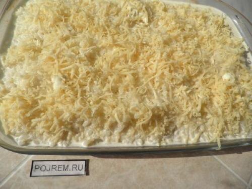 Ингредиенты: фарш рыбный – 350 г; рис – 1 стакан сыр твердый – 130 г; соус томатный – 100 мл; сметана, жирность 15% – 100 мл; яйца – 2 шт.; специи, соль Заходите на мой сайт и читайте ещё больше новых рецептов Способ приготовления: Отварить яйца вкрутую (10-15 минут после закипания), очистить, мелко порезать. Сыр натереть на мелкой терке. В миске смешать томатный соус и сметану. Рис промыть и отварить в воде до полуготовности,затем снять с огня, при необходимости слить воду. К рису добавить сыр и специи по вкусу. В рыбный фарш добавить перец, соль и перемешать. Форму для запекания смазать маслом, выложить половину риса. Сверху на рис выложить рыбный фарш. Затем выложить оставшийся рис. Далее выложить яйца, всё обильно залить томатно-сметанной заправкой. Посыпать запеканку тертым сыром. Запекать блюдо из риса и рыбы в микроволновой печи 15 минут на максимальной мощности. Готовую запеканку немного остудить, порезать и можно подавать на
