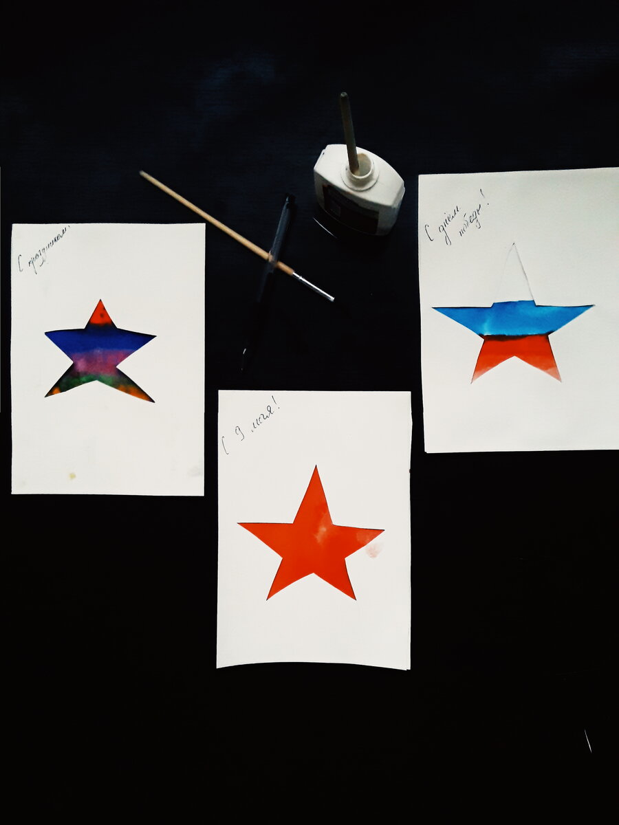 Если время поджимает и праздник уже на носу, а открытки сделать хочется - есть проверенный способ, который подойдет даже самым маленьким рукодельникам! Нам понадобится: Вооружаем маленького, но очень творческого человека кистью и красками, даем ему половину от белого листа и даем свободу действиям! А мы, тем временем, на второй половине листа вырезаем звезду (солнце, цветок, облако - что угодно!) Смотрите, какая красота получается! На самом деле, не нужно ограничиваться только красками, как мы с Тимошкой. Можно: Но мы торопились, поэтому подготовили три акварельных варианта: Попробуйте, это просто, весело и действительно ОЧЕНЬ быстро!