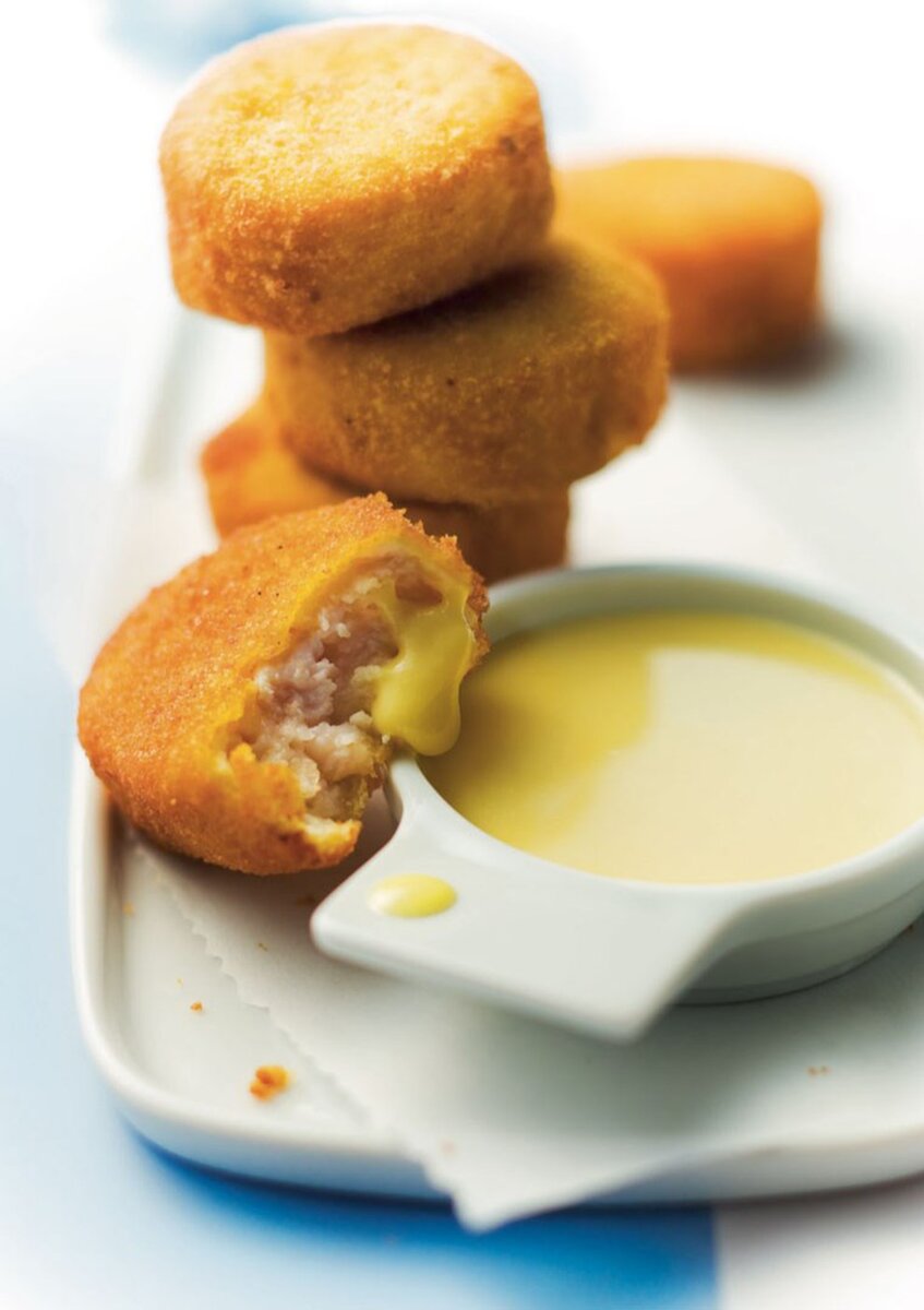 ИНГРЕДИЕНТЫ Куриное филе 400 г Сливки 200 мл Яичный белок 1 штука Соль по вкусу Перец черный молотый по вкусу Пшеничная мука 200 г Яйцо куриное 4 штуки Растительное масло 4 столовые ложки Панировочные сухари 200 г Молотый кумин (зира) 5 г Арахисовое масло 1 л Сыр гауда 100 г Молоко 100 мл ИНСТРУКЦИЯ ПРИГОТОВЛЕНИЯ 1. Мелко нарезать 100 г белого куриного мяса. В чаше блендера измельчить еще 300 г белого куриного мяса, смешав его со сливками и 1 яичным белком. Посолить, поперчить и переложить получившийся фарш в миску. Положить туда же кусочки куриного филе и хорошо перемешать. 2. Отмотать 25 см пищевой пленки, разложить на рабочей поверхности. На пленку выложить часть фарша и сформировать колбаску диаметром 3 см, завернуть ее в пленку, завязать на концах. Сделать несколько таких колбасок, использовав весь фарш. 3. Опустить колбаски в пленке в кастрюлю с закипающей водой и варить в течение 25 минут, следя за тем, чтобы вода больше не кипела. Извлечь колбаски, дать немног
