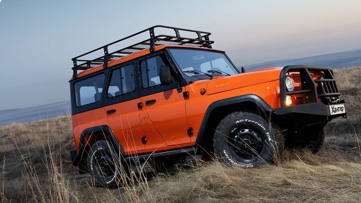 Новая версия Hunter оснащена экспедиционным багажником на крыше и лестницей, внедорожными покрышками BF GoodrichAll-Terrain размером 235/85 R16, силовыми бамперами и порогами, защитой рулевых тяг и лебедкой, а также специальной двухцветной окраской кузова (оранжевый и черный).