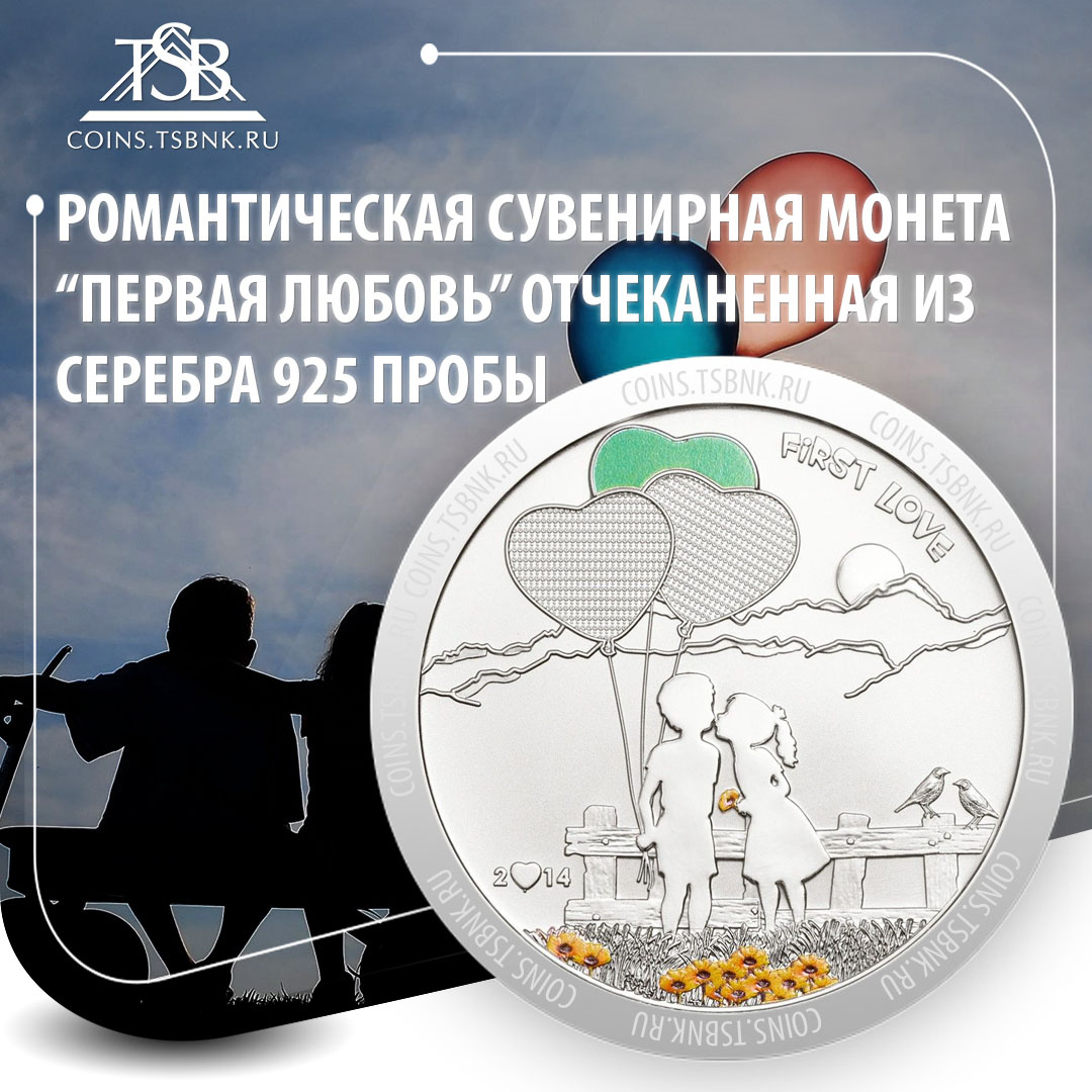 Романтическая сувенирная монета “Первая любовь” отчеканенная из серебра 925 пробы тиражом всего в 1500 штук. На монете автор нарисовал целующихся мальчика и девочку, которые стоят на лужайке возле деревянного забора, на котором уютно расположились две птички, развернувшееся друг к другу а вокруг них расположились красивые желтые подсолнухи. В руках мальчика находится 3 шарика в форме сердечка. По замыслу авторов, один шарик разукрашен в зелёный цвет, а два других по владельцу монеты следует разукрасить самостоятельно. Девочка в руках держит сорванный подсолнух, который еще называют цветок солнца. Монета каждым своим элементом указывает свое предназначение. Такую монету принято дарить второй половинке, или человеку с которым есть желание начать серьезные отношения. В верхней части на реверсе монеты присутствует надпись First Love, что в переводе обозначает первую любовь. Даже дата чеканки монеты 2014 год представлена таким образом, что нолик заменили символом любви - сердечком. МОНЕТА