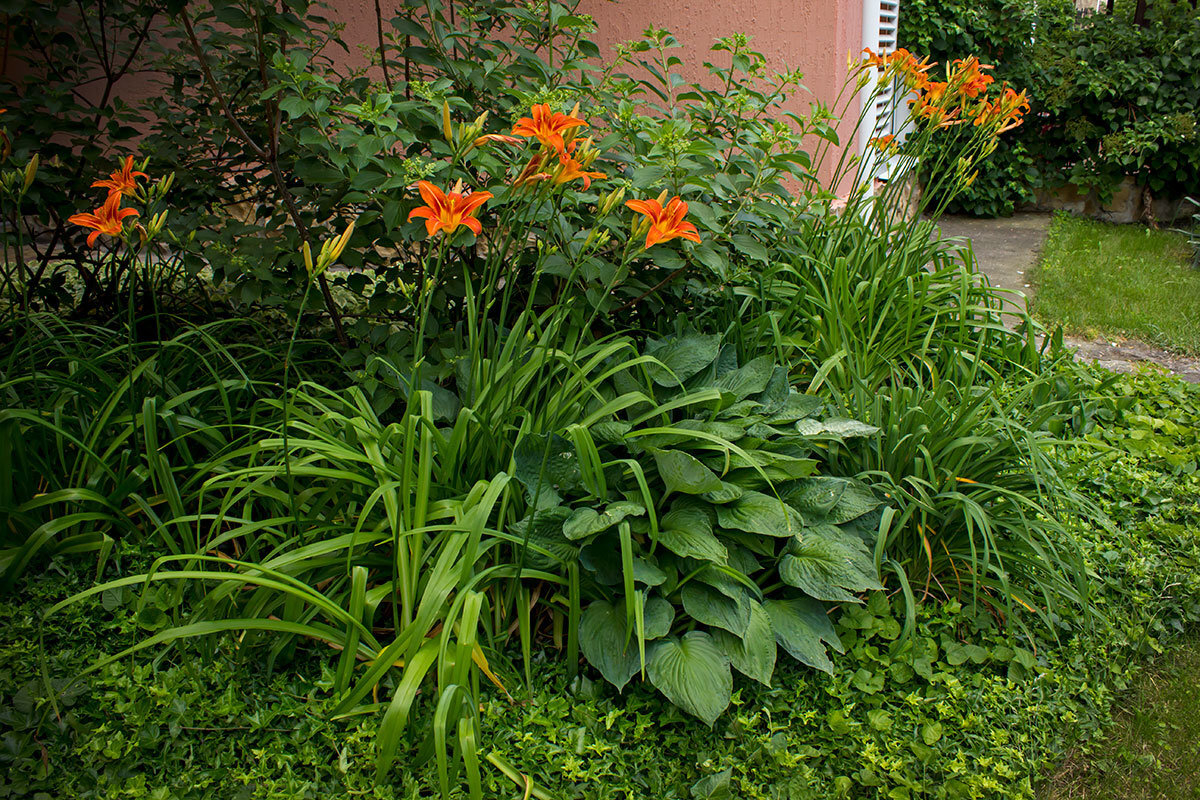 Если у вас есть место в огороде или цветнике, которое плохо освещается солнцем. То не обязательно оставлять его пустым. Можно посадить там тенелюбивые и теневыносливые цветы. Расскажу о моих фаворитах. Лилейник – очаровательный «долгоиграющий цветочек. Несмотря на то, что цветок живёт всего 1 день, завтра распускается уже следующий. В этом круговороте цветения, главное не забывать поливать кусты и убирать завянувшие цветоносы. Это сильно портит внешний вид растения. В тени лилейник прекрасно себя чувствует, да и поливать его нужно реже. За 2 – 3 года из одного кустика разрастаются целые заросли, поэтому нужно прореживать растения. Размножаются лилейники делением куста. Мне встречались бардовые и жёлтые сорта, но чаще всего можно встретить оранжевую расцветку. Хосты – настоящие царевны в цветнике. Они могут оживить и украсить даже самый неприметный угол вашего сада. У в моём саду обязательно будут хосты, но пока руки до них не дошли. Растение довольно неприхотливое. Вот только подкармли