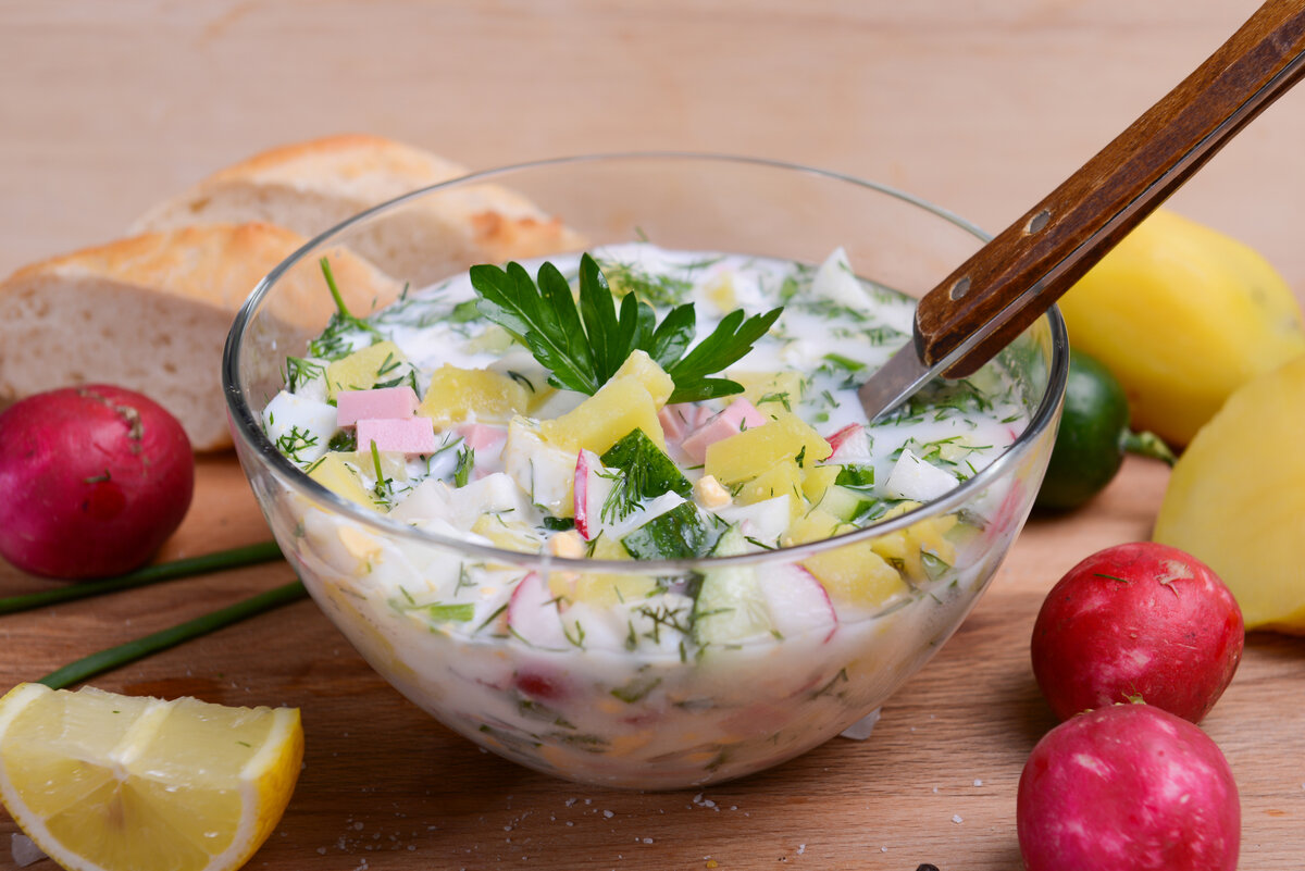 Минеральная вода разнообразит вкус окрошки на кефире, при этом блюдо не потеряет свои полезные свойства. Ингредиенты Колбаса докторская или салями - 200 гр. Кефир - 0,5 литра Сильногазированная минеральная вода - 0,5 литра Огурец - 4 шт. Картофель - 3 шт. Редис - 7-8 шт. Яйца - 2 шт. Лук зелёный - ½ пучка Укроп - 1 пучок Петрушка - 1 пучок Сок половины лимона Соль - по вкусу Как приготовить Сварите яйца и неочищенный картофель, остудите и почистите. Нарежьте колбасу, огурцы, редис, картофель и яйца небольшими кубиками. Мелко нарежьте зелень. Перемешайте в большой миске, добавьте кефир, минеральную воду, соль и лимонный сок. Тщательно перемешайте и охладите в холодильнике около часа. Блюдо готово. Ставьте лайк, подписывайтесь на канал и делитесь с друзьями в соцсетях, чтоб не пропустить новые рецепты.
