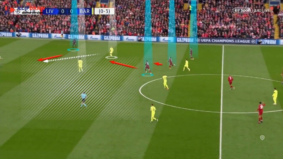 Хендерсон, как обезумевший несется на Альбу, заставляя его делать поспешные решения, которые приводят к ошибки, в тоже время посмотрите на Мане, он остается позади, видя что имеется поддержка спереди от него и что защитнику каталонцев нет вариантов, кроме как сыграть за боковую линию или отыграть на центральных защитников, Альба выбрал ошибочный вариант, Мане здорово прочитал игру, а центральные полузащитники вынудили сделать ошибку.
