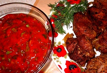 Про маринад все помнят, а вот про соус частенько забывают или дальше кетчупа не пробуют. А что если скажу рецепт, намного вкуснее кетчупа, готовиться на рез два, съедается моментально. Такое вот дело, что теперь часто друзья и родные готовят его, а не покупают соусы. Для начала сразу скажу, перец вы можете добавлять а можете и нет, так как это дело вкуса и возьми. Ведь его придётся перетереть и превратить в пюре, а блендер не у каждого есть, я это прекрасно понимаю. Но если всё же есть, то сделайте этот шаг не пожалеете, и добавьте на 1 зуб чеснока больше. Затем мелко порубите зелень, обязательно добавьте кинзу, в холодное томатное пюре высыпаем соль и приправу, затем добавляем оставшиеся ингредиенты. Так же я слегка прокипячу его, чтобы он был более густой. Важно, после того, как все перемешаете обязательно оставьте его в покое на 3 часа, чтобы он настоялся и выдал вам все соки. Его как раз хорошо готовить вместе с маринадом, одинаково по времени настаиваются. Приятного аппетита!