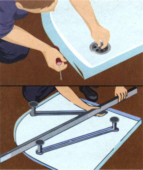 Душевая кабина угловой конструкции наиболее подходит для небольших ванных комнат и санузлов, бань где рациональное использование площади первейшая задача. Благодаря компактности душевой кабинки, наличию автоматизированных систем - затраты горячей воды и электроэнергии сводятся к минимуму. Рассмотрим порядок монтажа на примере самой простой модели. Предварительно требуется выровнять пол по горизонтали и стены по вертикали для плотного примыкания кабины к стене, а также в месте установки обустроить раструб канализационной трубы для отвода стоков и подвести трубы для подачи горячей и холодной воды. Инструменты для работы: уровень, отвес, карандаш, отвертка, набор гаечных ключей, разводной ключ, дрель, перфоратор. Сборка угловой душевой кабины своими руками Устанавливаем воронку слива в отверстие поддона. Переворачиваем его и фиксируем ножки. Выводим сток в раструб канализационной трубы. Регулируя ножки. выравниваем положение поддона по уровню. Закрываем пространство от пола до поддона де
