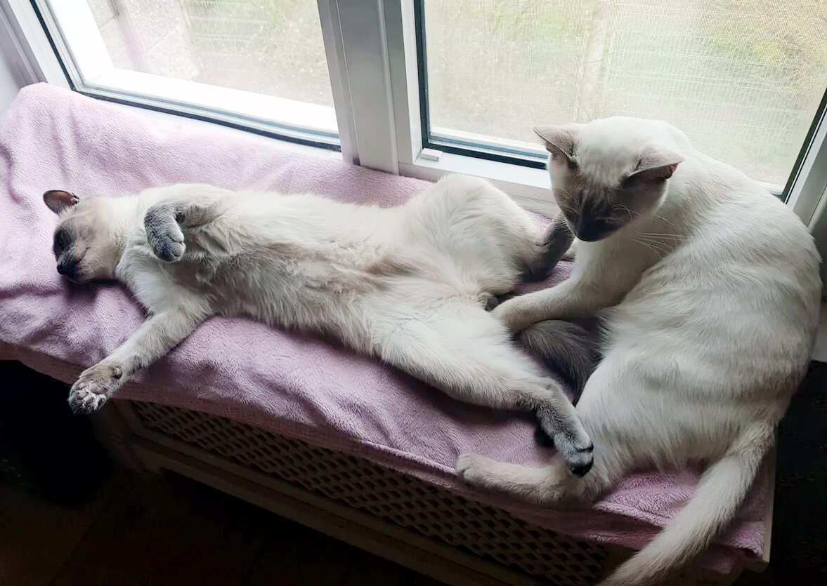 В доме огромное количество мест с кошачьими лежанками, да и в каждой из комнат их по несколько штук, но нет... выбирать нужно именно ту лежанку, на которой уже устроился и удобно лежит другой котик. Причем, непременно нужно залазить и занимать место с той стороны, где его (места этого) почти не осталось... Главное, ни в коем случае не обращать внимание на другой кусок лежанки, где еще пару котов при желании поместились бы, и продолжать размещаться на узком пятачке и желательно сверху на что-то мягкое, теплое, пушистое... и недовольное :)) Так у нас действует кот Митя. При этом, у него это получается так забавно, без какой-то наглости и "нахрапа" с мордочкой, на которой написано, что маленький милый котик просто поспать пришел к старшему товарищу - что тут такого? :)) "Старший товарищ", который уже давно успел уютно примоститься, категорически против этого рейдерского захвата лежанки и пытается сопротивляться тому, что на него сейчас сверху улягутся. В ход идут легкие оплеухи: Но н