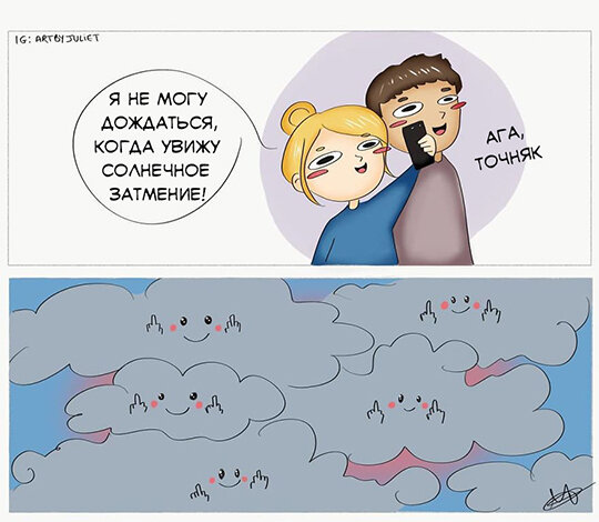 В одном из районов прекрасного Парижа родилась, живёт и работает молодая девушка по имени Джульетта (а точнее Жюльет) - графический дизайнер, начинающая художница, автор комиксов, неисправимая оптимистка и большая любительница кошек! Вот уже почти целый год она радует любителей светлого и лёгкого юмора по всему интернету своими забавными комиксами, в которых рассказывает о ежедневной жизни девушек и проблемах, возникающих по ходу этой самой жизни. Жюльет смотрит на все проблемы с юмором, и поэтому, по её словам, почти всегда находится в хорошем настроении и способна быстро найти выход из любой ситуации. Серия её комиксов получила название "ArtByJuliet" и уже собрала почти 50 тысяч поклонников в Instagram! Изначально девушка рисовала эти комиксы только на французском, но позже, увидев интерес англоязычной аудитории, стала делать версии ещё и на английском языке. Мы перевели несколько комиксов этой талантливой художницы и с радостью делимся с вами! #1 #2 #3 #4 «Раньше я думала, что фран