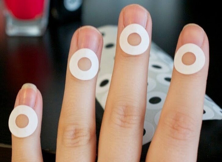 Во-первых, используйте цвет, который вы хотите, чтобы ваш полумесяц был красивым. Затем необходимо наклеить на пленочки, как показано на рисунке выше. Покрасьте открытую часть другим цветом. Снимите наклейки и нанесите Топ.