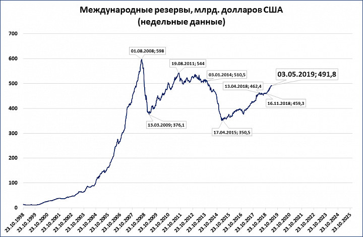 ЗВР (недельные данные) на 3 мая достигли 491,8 млрд. долларов. Это на 0,2 млрд. долларов выше предыдущего рекорда (491,6 – 12 апреля). Речь о рекорде за последние 5 лет. Исторический же рекорд был установлен в августе 2008 года – 598 млрд. долларов. П.С. ЦБ объявил, что после майских праздников начнёт докупать валюту, которую не купил (по бюджетному правилу) в августе-декабре прошлого года из-за опасений за курс рубля. Так что рост ЗВР продолжится и даже ускорится. При прочих равных это может улучшить ситуацию с рублёвой денежной массой. П.П.С. Если бы ЦБ ещё и ставку приподнял, то мог бы насыщать экономику рублёвой массой намного смелее...