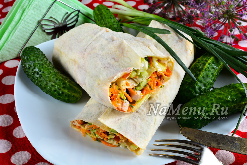 🌮Необходимые продукты: ✅1 тонкий лаваш, ✅300 гр. копченой курицы, ✅250 гр. корейской морковки, ✅1 свежий огурец, ✅150 гр. свежей капусты, ✅немного зеленого укропа, ✅100 гр. майонеза, ✅100 гр. кетчупа 🐓Курицу нарезать кубиками 🥒Нашинковать капусту и огурчик 🥄Раскладываем лаваш, поливаем его майонезом и кетчупом 🥕Раскладываем по поверхности лаваша корейскую морковку, капусту, огурцы, мясо, нарубленный укроп 🌯Свернуть лаваш в рулет, чтобы вся начинка оказалась внутри, поставить в холодильник на 15-20 мин. https://namenu.ru/9179/Lavash_s_kuricej_i_korejskoj_morkovkoj/