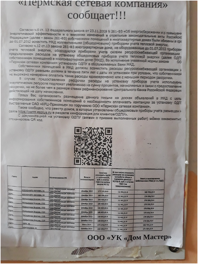 - в тексте - "Прошу Вас организовать размещение данного письма на досках объявлений в МКД с целью информирования собственников о необходимости оплачивать квитанции за установку ОДП...."