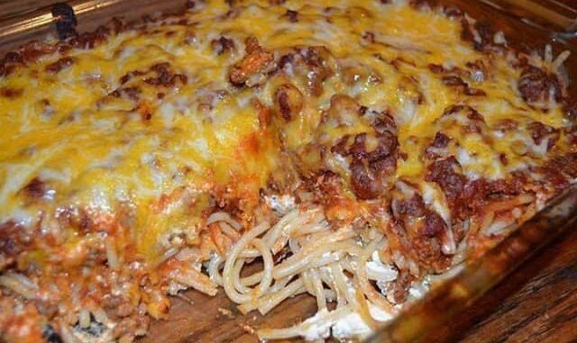 Спагетти, представленные в этой статье приятно удивят твоих близких! Ингредиенты: - 500 грамм говяжьего фарша - 1 банка соуса для спагетти - 200 грамм сливочного сыра - ¼ Стакана сметаны - 250 грамм творога ( 1 стакан) - ½ Стакана сливочного масла - 1 упаковка спагетти (400гр) - Тертый сыр Способ приготовления: 1) Разогреть духовку до 180°. Отварите спагетти. Слейте воду и отложите в сторону, пока подготавливаете другие ингредиенты. 2) Смешайте сливочный сыр, сметану и творог и хорошо размешайте полученную смесь до однородного состояния. 3) Поджарьте фарш, когда закончите слейте масло. Смешайте фарш с соусом для спагетти. 4) Положите несколько кусочков масла в противень, затем положите половину спагетти сверху. 5) Возьмите смесь сливочного сыра и вылейте поверх лапши. Хорошо пропитайте лапшу. 6) Вылейте оставшуюся лапшу поверх сливочно-сырной смеси. Поло