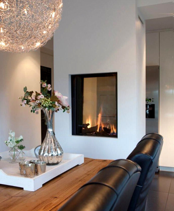 Вот рецепт уютного интерьера. Вместо телевизора в центре гостиной мы ставим камин. Камин может символически отделить гостиную от столовой и кухни. Если мы используем стеклянные вставки с двух сторон в камине, мы получим интересный эффект и возможность наблюдать за огнем как из кухни, так и из гостиной. Стена, на которой расположен камин, может иметь вертикальную, высокую нишу, предназначенную для хранения дров, что само по себе станет интересным декоративным элементом. Нет дымохода? Не беда. Можно использовать газовый камин и правильно спроектировать отведение продуктов горения. Ле