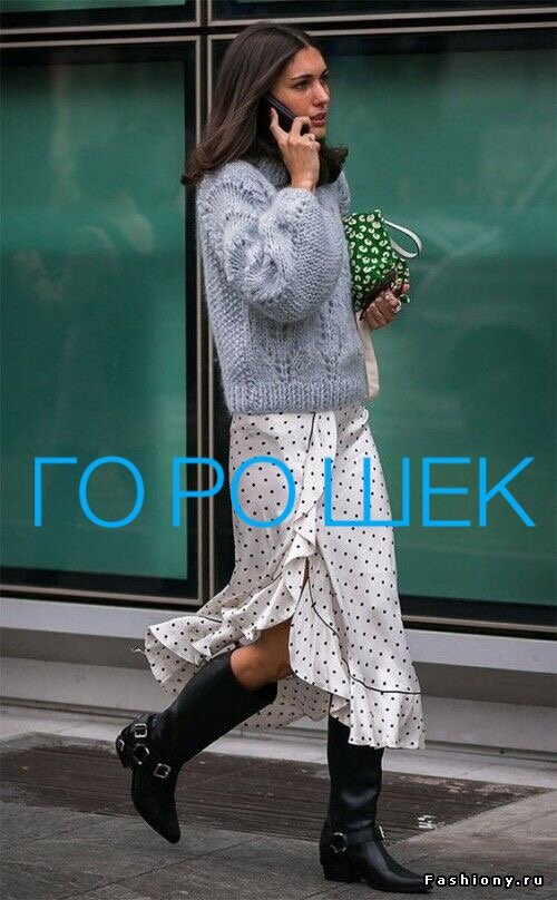 База базовая, масло масленное скажете вы. Но! Посмотрите СКОЛЬКО тут горошка. Пальто долматинец. Коричневый всегда хорошо смотрится с темно-синим. Разный по диаметру горох - тоже необычный способ отличиться. Платочек на сумку - тренд. Я бы, скорее всего, убрала горох с пальто. Думаю однотонное чёрное или белое пальто здесь смотрелось бы лучше.