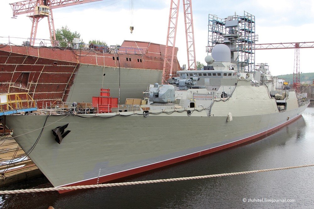 За воротами цеха можно увидеть уже построенные и готовые к ходовым испытаниям корабли. Это фрегат «Гепард», он же сторожевой корабль проекта 11661. Корабли предназначены для выполнения комплекса задач: поиска и борьбы с подводными, надводными и воздушными целями, несения дозорной службы, проведения конвойных операций, а также охраны морской экономической зоны.