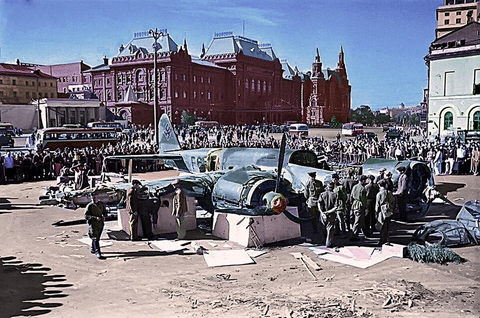 Юнкерс - 88 на пл. Свердлова в Москве , июль 1941 года. Самолет Юнкерс Ю-88 (Ju 88) с кодом F6+AK (номер 0285) был сбит 25.07.1941 летчиками 3-го истребительного авиакорпуса около Истры и совершил вынужденную посадку на поляну. Через пять дней его установили на площади Свердлова (ныне Театральная площадь) в Москве. Ю-88 принадлежал 2-й дальнеразведывательной эскадрилье 122-й разведывательной группы (2.(F)/122), совершал разведывательный вылет в район Москва-Калуга. Экипаж: лейтенант Вильгельм Штукманн (Wilhelm Stuckmann) — пилот; фельдфебель Вильфред Андерс (Anders, Wilfred) — штурман; ефрейтор Бруно Сильверт (Bruno Sievert) — радист; ефрейтор Людвиг Вернер (Werner Ludwig) — стрелок. Информации о судьбе экипажа нет, в немецких архивах числится пропавшим без вести.