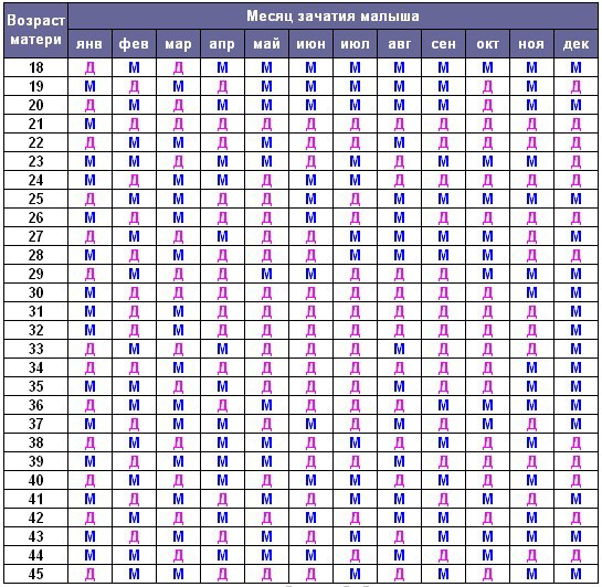 Каждый месяц года, в котором мать находится в том или ином возрасте, помечен буквой «д» (девочка) или «м» (мальчик). Достаточно отсчитать 9 месяцев назад от месяца с нужной буквой, чтобы начинать работать над зачатием в определённый срок. Как считают китайцы, этот способ даёт почти стопроцентный результат.
