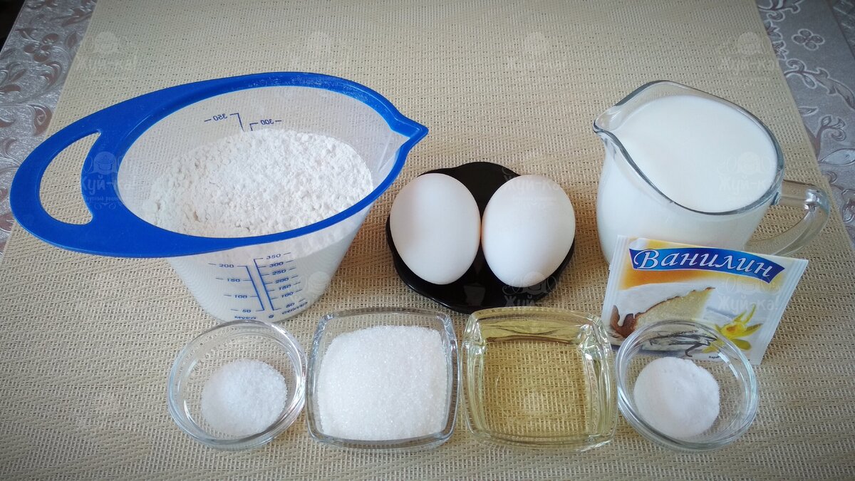 Потихоньку всыпаем заранее просеянную муку с ванилином и содой. Не перестаём при этом перемешивать. Тесто по консистенции получится жидкое, как на блины: