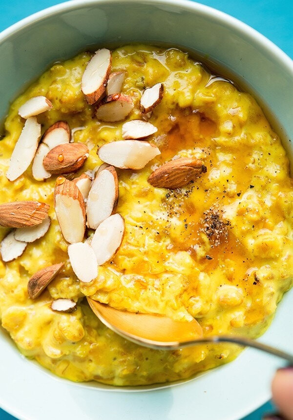 Какие рецепты завтрака нам нравятся больше всего? Нам кажется, что вы с нами согласитесь - те, которые быстрые, простые и в то же время уникальные. И было бы хорошо, чтобы это было хорошо для нашего тела. И чтобы они не требовали труднодоступных ингредиентов. О, и последнее, было бы неплохо, если бы такой завтрак не требовал от вас стоять у плиты, только чтобы вы могли одновременно сделать кофе и покрасить хотя бы один глаз. И если бы это было еще что-то новое, которое зарядит вас положительными эмоциями с утра. Да, именно так и выглядит золотая каша. Это вариант аюрведического золотого молока для завтрака, который в этой форме чудесно нагревается, адекватно насыщает и имеет прекрасный вкус. Во всяком случае, мы действительно не хотим держать вас здесь слишком долго - попробуйте сами, и тогда вы все поймете. Золотая каша Время приготовления: до 30 минут Ингредиенты на 1 порцию: - 1 чайная ложка кокосового масла; - 1/2 чайной ложки куркумы; - щепотка черного перца; - 1/4 чашки овсяных х