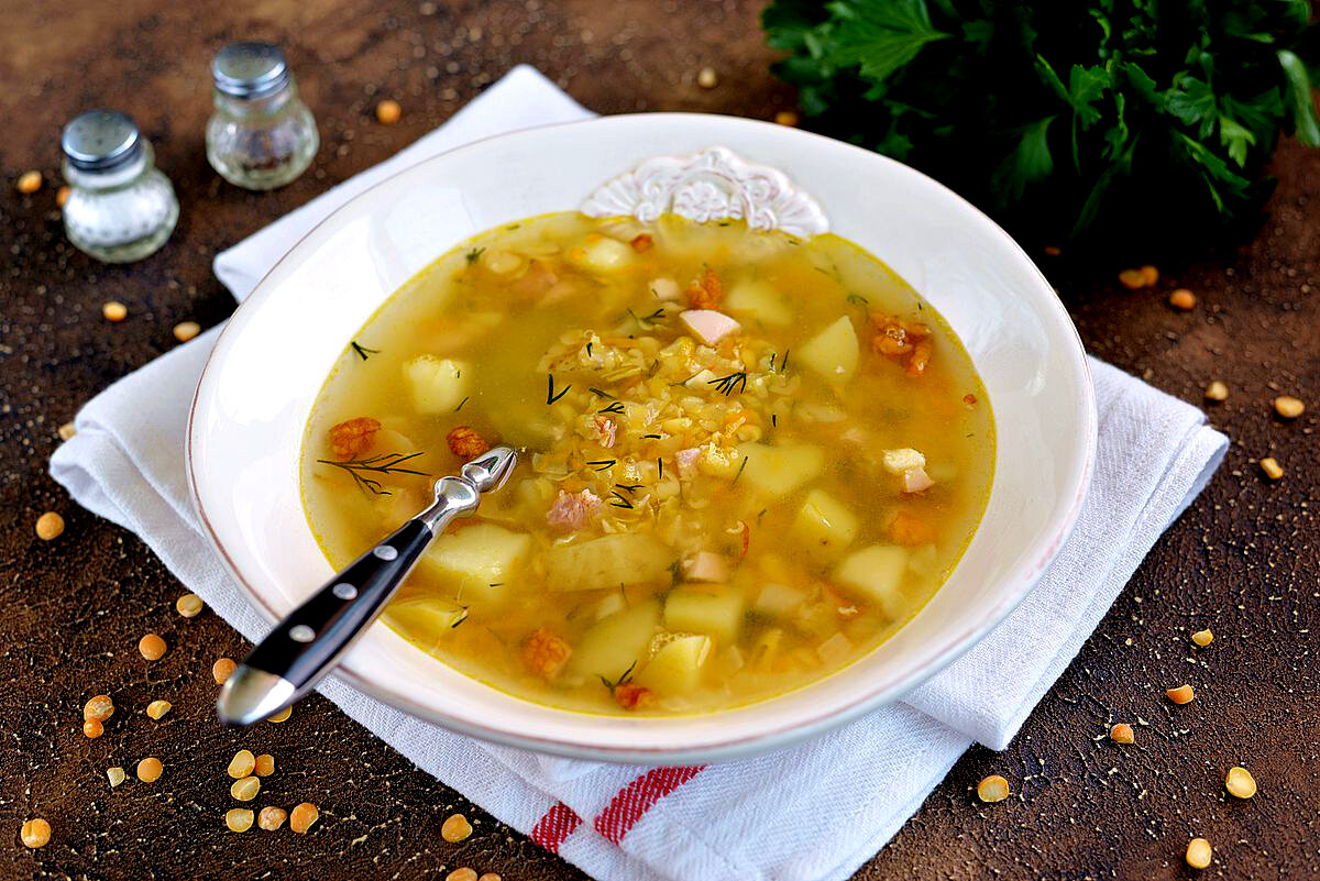 Хочу рассказать Вам как я варю вкуснейший гороховый суп с копченостями. Чтобы приготовить такой суп нам нужны:свиные копченые ребра,морковь,лук,картошка,горох,чеснок,горчица, специи и соль. Свиные копченые ребрышки отправляем вариться(можно любые другие копчености) в холодную воду. Замачиваем горох. Лайфхак-дробленый горох вариться быстрее! После кипения ребер(около 15 минут)добавляем горох.Когда бульон закипит обязательно убираем пенку.Теперь ждем когда свариться мясо и начнет разваливаться горох. Режем кубиками картошку и когда ребра сварились достаем их и даем остыть.Добавляем в бульон картошку.Нарезаем мелкими кубиками лук и трем на терке морковь.Обжариваем лук и морковь на растительном масле.Если любите можно добавить болгарский перец и помидор,они не испортят вкуса! Овощи сильно не зажариваем. Когда мясо остынет,мы снимаем его с костей , режем на кусочки и добавляем в бульон.Туда же и зажарку. Доводим суп до кипения и добавляем соль,специи и лавровый лист.По вкусу вы можете