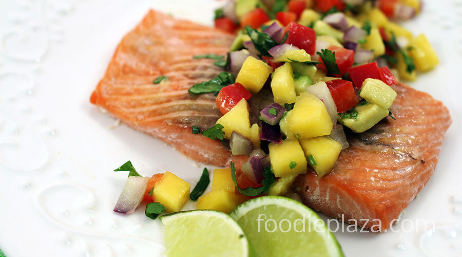 Запеченный в духовке лосось с сальсой из манго и авокадо – блюдо, сочетающее в себе богатую питательную ценность, яркий презентабельный вид и неповторимый вкус. Сладковато-пряная освежающая сальса прекрасно дополняет насыщенный вкус красной рыбы и обогащает блюдо полезными витаминами и минералами. Сочный сладкий манго, кремовый авокадо, хрустящий сладкий перец, свежий лайм, красный лук и пряная кинза – все, что вам нужно для очень быстрой в приготовлении восхитительной сальсы. Готовится сальса очень просто и быстро. Рекомендую приготовить ее в первую очередь и убрать в холодильник: пока лосось будет запекаться – сальса пропитается соками и станет еще вкусней. Для приготовления сальсы вам нужно нарезать кубиками фрукты и овощи и добавить к ним свежевыжатый сок лайма – очень просто! Чтобы нарезать манго мелкими кубиками, вы можете воспользоваться следующим методом: поставьте плод вертикально и отрежьте с обеих сторон по овальному куску (так называемые «щечки»). С помощью небольшого ножа
