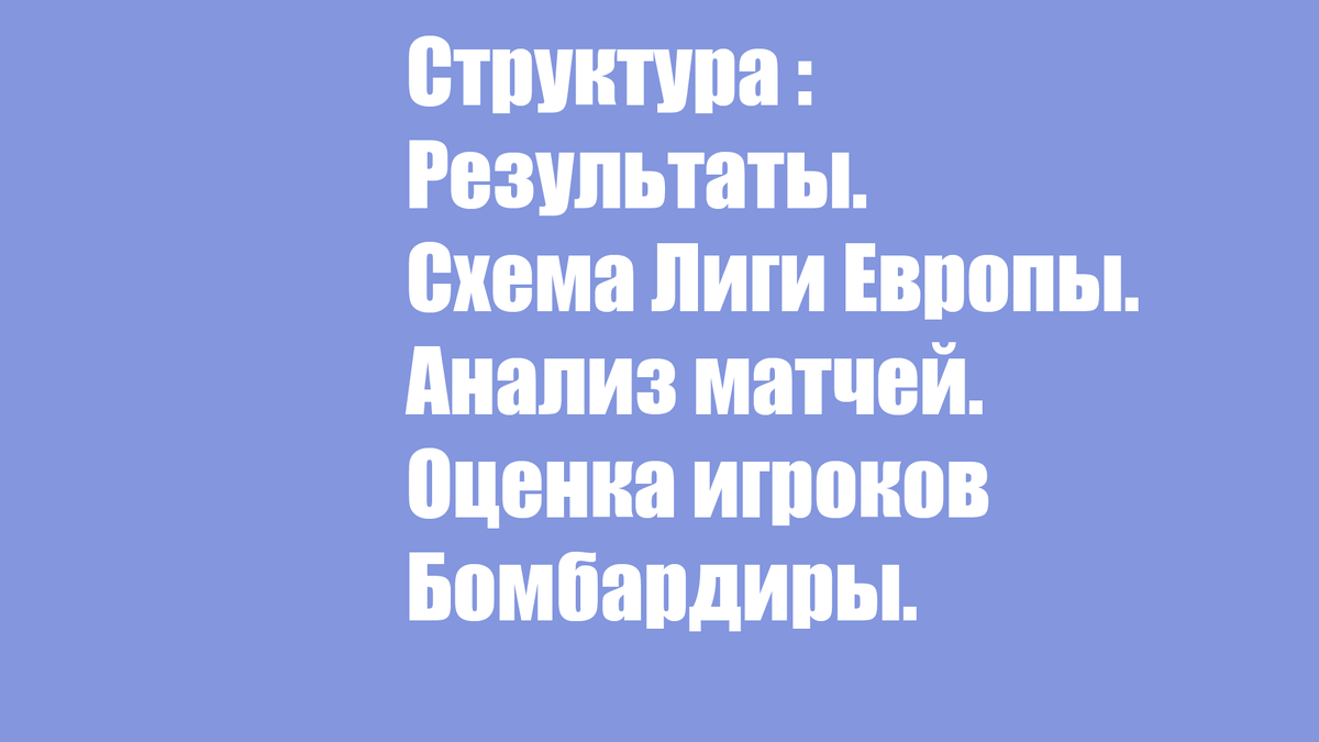 Приготовились. Структура выпуска: Результаты. Схема Лиги Европы. Анализ матчей. Оценка игроков и бомбардиры.