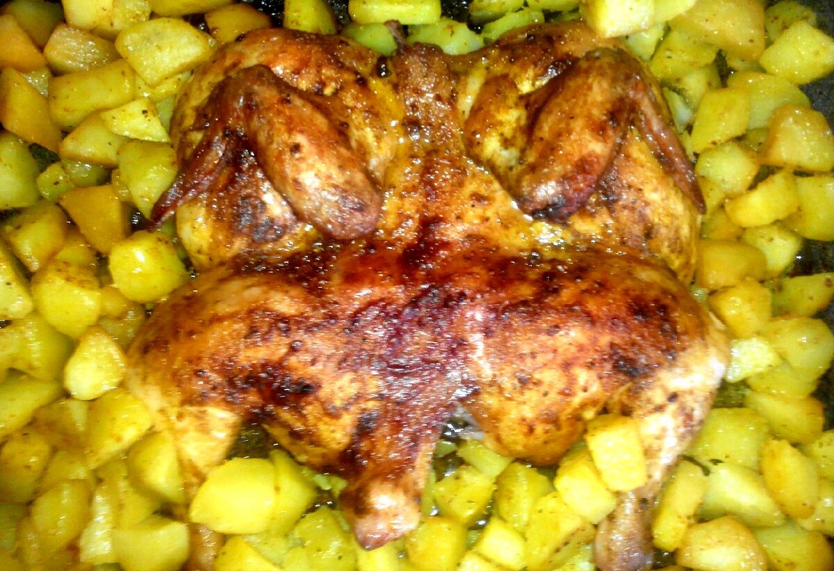 Для приготовления вкусной курочки с золотистой и хрустящей корочкой, пропитанной собственным соком и ароматными приправами нам понадобится: Целую тушку курицы разрезаем вдоль по грудке, промываем. Солим, натираем приправой для курицы. Переворачиваем, укладываем курицу в форму для запекания. Сверху полностью обмазываем майонезом и тоже посыпаем приправами. Запекаем в духовке около 2-х часов при 140 градусах. Отдельно в подсоленной воде отвариваем до полуготовности картофель (минут 5-10 в зависимости от самого картофеля), нарезанный дольками. Сливаем воду. За пол часа до готовности: За 15 минут до готовности: Получается вот такая вкуснятина! Готовьте на здоровье! Приятного аппетита! ЕСЛИ НЕ ТРУДНО: Подпишитесь на мой канал и поставьте лайк) Помогите каналу развиться)))