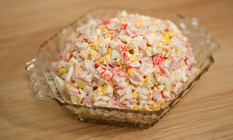 Давайте я приведу пару примеров крабового салата: Крабовый с огурцом и кукурузой; Крабовый салат с рисом и кукурузой; Крабовый салат с пекинской капустой.