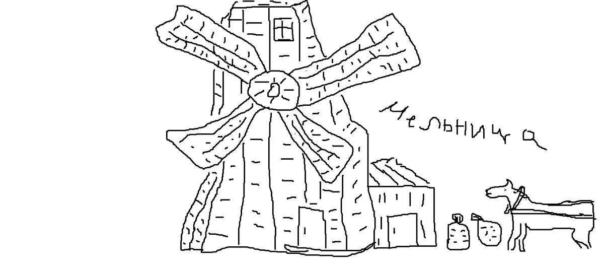Когда то,давным давно в моём посёлке,как и во многих других была построенна ветрянная мельница.Мельница целиком была сделанна руками людей из металла и дерева.В ней были огромные деревянные шестерни,центральная ось, составленная из нескольких вертикально расположенных обтёсанных стволов деревьев, которая была связанна, крепко на крепко металическими кольцами, которая приводила в движение эти огромные шестерни,которые в свою очередь приводили в движение верхний жернов, сделанный целиком из камня который вращаясь вокруг своей оси, тёрся о жернов расположенный под ним, который в свою очередь был закреплён жестко на станине, сделанной из дерева.Под конструкцией жерновов был желоб, по которому сползала мука под воздействием вибрации и насыпалась в мешки.Электричества тогда в то время не было и люди использовали ветер как достаточно мощьную двигательную силу.Мельница могла врашаться вокруг своей оси(очень интересный механизм был у неё).Поворачивалась тоже засчёт ветрянной энергии и внутренн