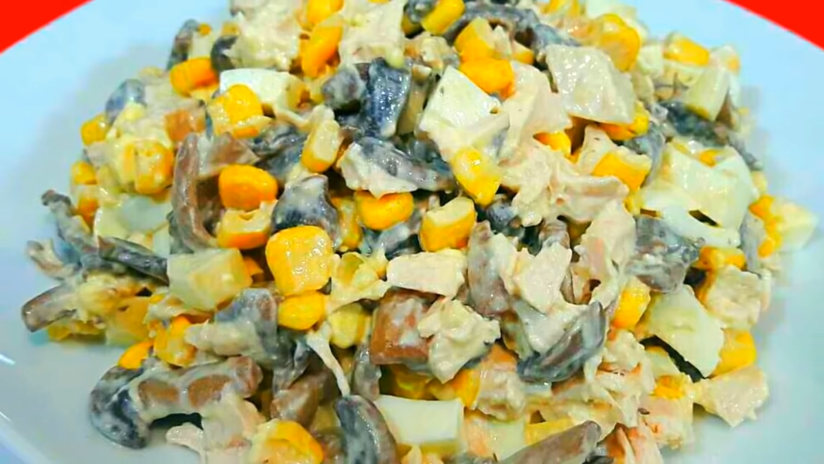 Соль Куриную грудку и яйца я предварительно отварила. Начнем с курицы,куриную грудку я мелко порежу и переложу в глубокую емкость. Также мелко нарезаю яйца Грибы я нарежу и обжарю Разогреваем сковородку,вливаем растительное масло и отправляем обжариваться грибы. Грибы выделяют много жидкости,поэтому ждем пока она выпарится. Как только влага вся выпарилась, подсаливаем и даем им буквально еще одну минуту потушиться.Далее подождем пока грибы остынут и можем добавлять их к нашему салату. В салат так же добавляем кукурузу,немного подсаливаем, заправляем майонезом и все хорошо перемешиваем. На этом наш салат готов,можно подавать к столу! Салат получается очень вкусный,сытный!Обязательно попробуйте,я д