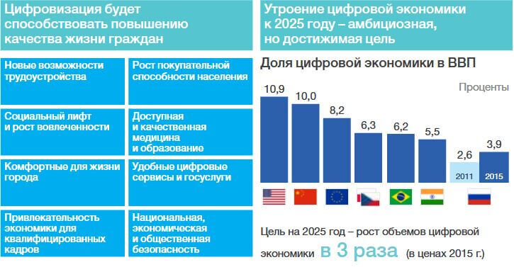 А ещё обеспечить ежегодный выпуск 120 тысяч дипломированных IT-специалистов, предоставить 97 процентам российских домохозяйств широкополосный доступ в интернет со скоростью не менее 100 МБит/с (в 2016 году средняя скорость равнялась 12 МБит/с).
