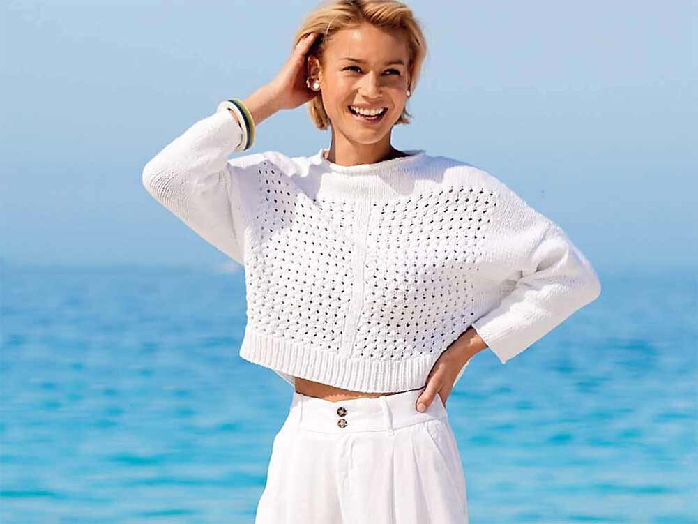 Короткий хлопчатобумажный пуловер с ажурными вставками. Такой пуловер хорошая находка для летнего гардероба. Размеры: 36/38 (40/42) 44/46. Вам потребуется: пряжа (93% хлопка, 7% полиэстера; 105 м/50 г) - 400 (450) 500 г белой; спицы №5; короткие круговые спицы №5. УЗОРЫ Резинка 1 х 1: нечетное число петель. Лицевые ряды: кромочная, попеременно 1 изнаночная, 1 лицевая, закончить 1 изнаночной, кромочная. Изнаночные ряды: петли провязывать по рисунку. Лицевая гладь. Ажурный узор А: число петель кратно 3 + 1, вязать согл. схеме. На ней даны лицевые ряды. В изнаночных рядах петли и накиды провязывать