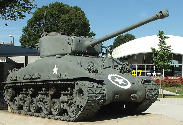 Второй по массовости танк времён Второй мировой войны. Выпускался в США и некоторыми другими западными странами антигитлеровской коалиции в основном за счёт американской программы Ленд-лиз, которая обеспечила военную поддержку иностранных союзных держав. Средний танк «Шерман», имел стандартное 75-мм орудие с боезапасом в 90 снарядов и был снабжён относительно тонкой лобовой (51 мм) бронёй по сравнению с другими машинами того периода.