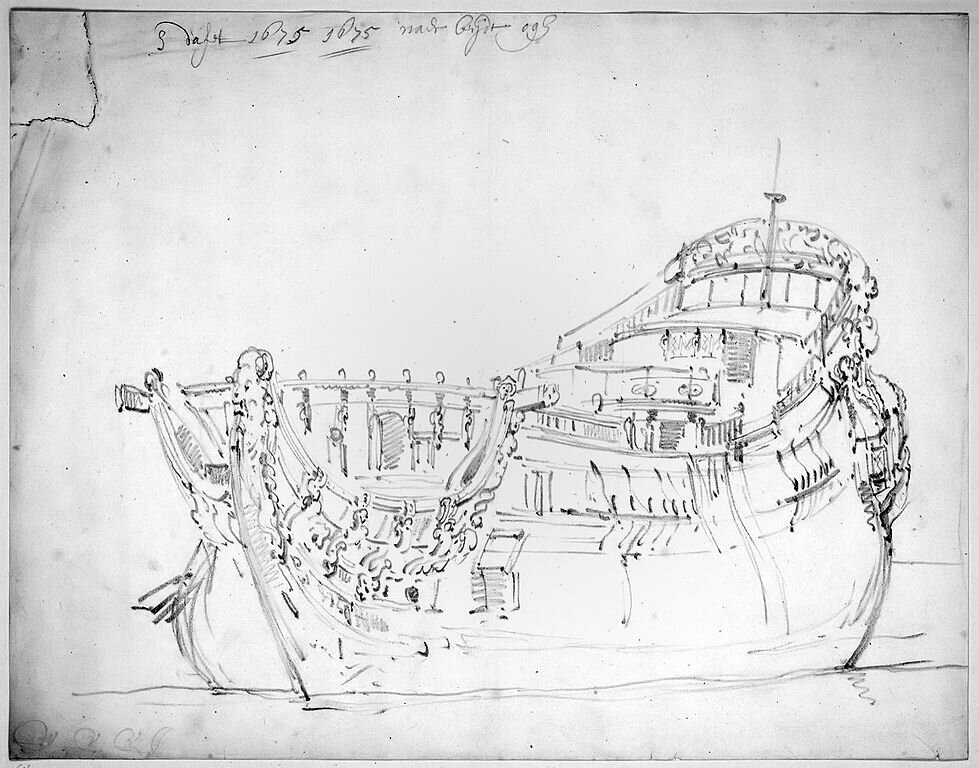 В 17 веке корабли принимают те пропорции, которые останутся почти неизменными до конца эпохи деревянных парусных судов. Военный корабль того времени был богато украшен скульптурами и прочим декором. Нос, корма, а то и борта были перегружены красивостями - это считалось необходимым для поддержания высокого боевого духа моряков. Виллем Ван де Велде Старший (1611 - 1689) - голландский маринист из династии художников ван де Велде. В молодости служил на флоте, затем стал официальным художником голландского флота. Отец художников Виллема ван де Велде Младшего и Адриана ван де Велде. Итак, несколько рисунков кораблей исполненные моряком и мастером живописи. St David, 54-пушечный корабль Английского флота. HMS Dover, 40-пушечный английский фрегат. Участвовал в битве при Солебее в 1672 году. Корабль капитана Блада должен был выглядеть примерно так. Portsmouth, 38-пушечный английский фрегат. Resolution, 70-пушечный английский корабль 3-го ранга. Участвовал в экспедиции против берберийских