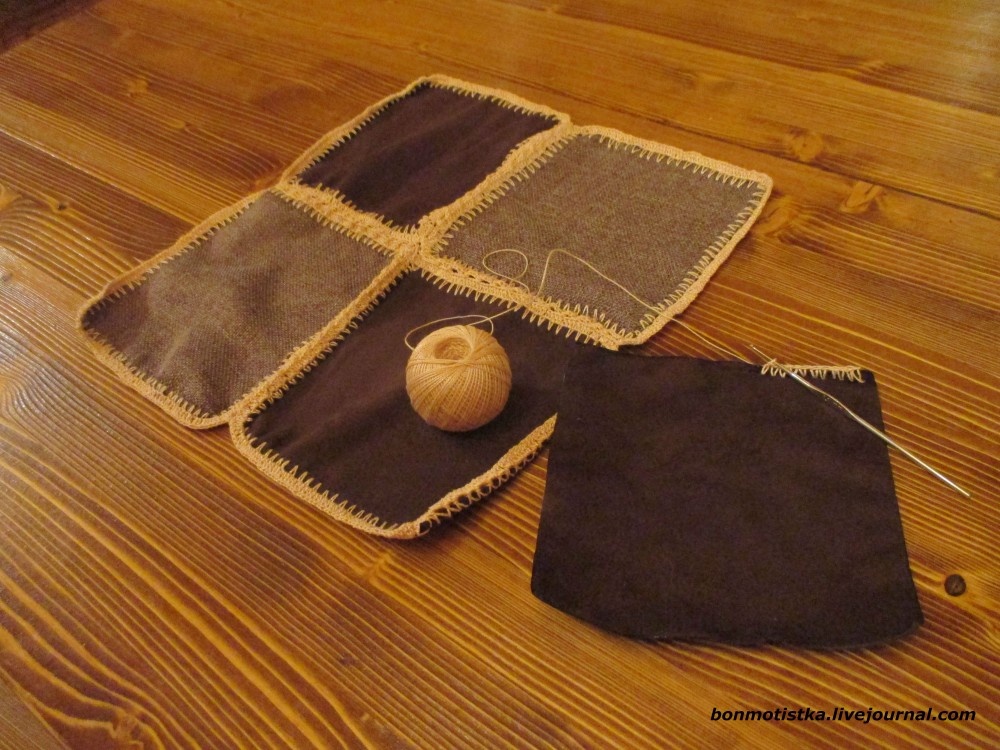 Потом... должна же быть в деревянном доме хоть одна вещь, выполненная в лоскутной технике! Вот из обрезков от штор, тех, что в спальне (рогожка), и тех, что заглядывают в нее из открытых дверей (под замшу), накроила 256 квадратиков 15 на 15 см.