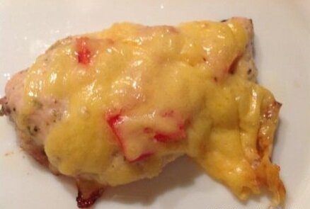 Продукты для приготовления данного рецепта: Куриное филе - 0.5 кг Болгарский перец - 1 штука (может уйти меньше) Сыр твердый - 120-150 грамм Для маринада: Майонез - 3 столовые ложки Горчица - 1.5 чайной ложки Перец - на кончике ножа Соль - 1 щепотка (либо по вкусу) Чеснок - 2 зубчика Приступаем к приготовлению рецепта: 1. Куриное филе тщательно помыть, разрезать каждый кусок на 3 части (размером примерно 5 на 5 см). 2. Куриное филе слегка отбить, переложить в тарелку и замариновать. Поставить в холодильник минимум на 20 минут (можно поставить на всю ночь). 3. Выложить кусочки филе на смазанный противень. Сверху положить резанный квадратиками болгарский перец. 4. Посыпать тертым на крупной стороне терки сыром. 5. Отправить в духовку на 30-45 минут при температуре 160-180°C. На гарнир отлично к куриному филе отлично подойдут овощи на пару. Приятного аппетита.