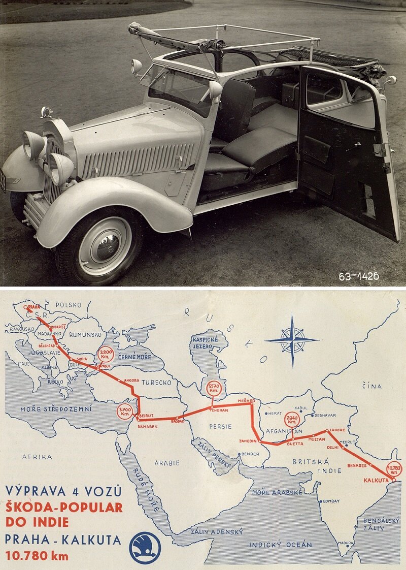 85 лет назад, 12 мая 1934 года, четыре автомобиля ŠKODA POPULAR отправились из Пражского автомобильного клуба в Индию. Полукабриолеты были оснащены четырехцилиндровыми двигателями объемом 1 л и развивали мощность 20 л.с. (15 кВт). Новая модель ŠKODA перевозила груз весом 800 кг, включая пассажиров, при этом ее собственный вес составлял всего 700 кг. Возглавлял автопробег Збислав Петерс (Zbislav Peters), чехословацкий юрист и хоккеист. Он повел экспедицию из семи человек в Индию через Балканы, Турцию, территорию нынешний Сирии и Ирак. Один из экипажей даже увеличил протяженность маршрута, дополнительно заехав в Афганистан. После прибытия в Калькутту автомобили ŠKODA POPULAR отправились в Мумбаи, а оттуда на корабле – в Триесте. Из этого портового города на севере Италии они вернулись обратно в Чешскую Республику, прибыв в Прагу 10 сентября 1934 года. На тот момент за плечами участников было порядка 15 000 км, при этом большая часть пути проходила по плохим дорогам и в тяжелых климатичес