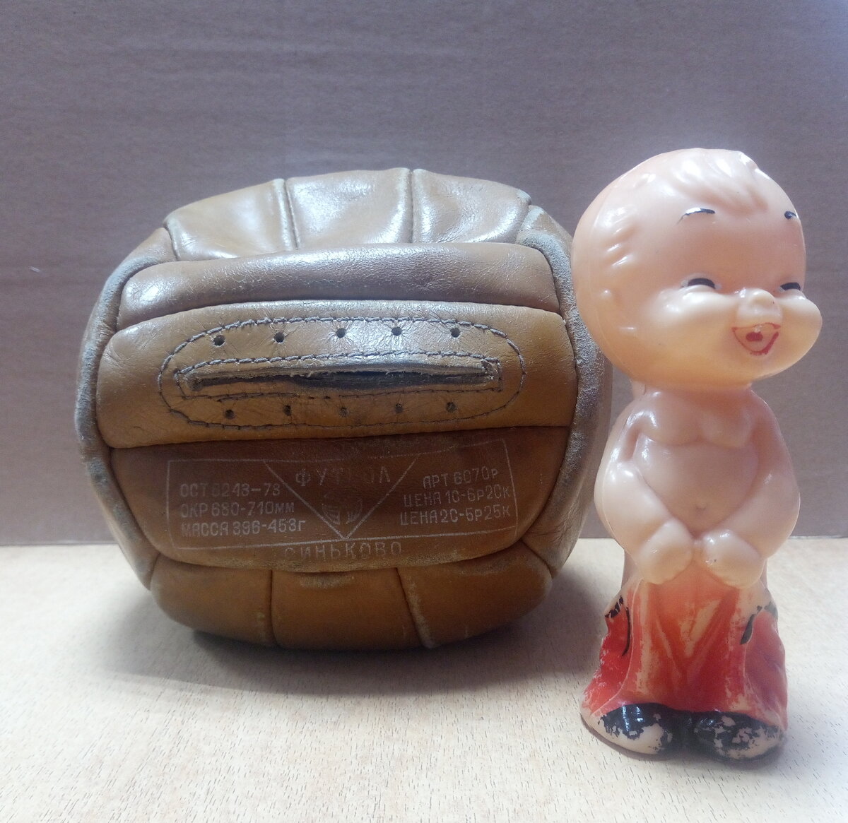 На днях принесли кожаный мяч 70х годов, купили мы его за 250рублей, изготавливался в Синьково Московской области, с виду потертый, не один день летал по футбольному полю. Мы его решили привести немного в порядок, кожа уже стала жесткой. Чтобы сделать поверхность мяча более эластичной в советское время кожу протирали касторовым маслом. Внутренняя камера резиновая, от времени стала тоже жесткой и могла треснуть у соска. Обычно резиновые изделия протирают силиконом, он хорошо впитывается в резину и не дает изделиям трескаться. После пропитки камера и кожа мяча стали более эластичными. Футбольный сезон у нас всегда начинался весной, когда сходил снег и подсыхала земля, мячи футбольные тогда были не у всех, из за цены в 6 рублей 20 копеек. Весной доставали мяч, который пролежал на полке всю осень и зиму, обычно он был сдут, мы расшнуровывали мяч, распрямляли сосок камеры, надували ее , и снова загибали сосок, связывая его. Если камера была не в порядке, то покупали в магазине новую за 30