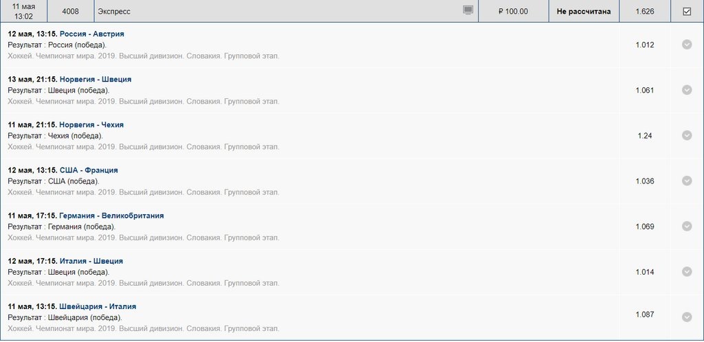 Правда по маленьким кэфам меньше 1.4 играть как-то неинтересно, но чем больше кэф, тем больше риск слить всю сумму. Самый большой кэф из сыгравших ставок был 4. Это был экспресс еще на групповой стадии на 4 матча.