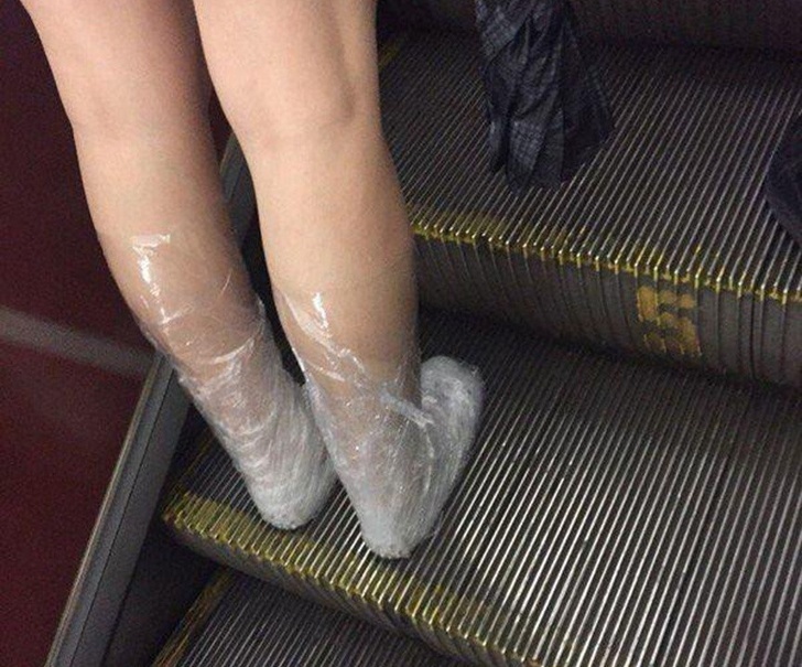 Обожаю людей которые всегда найдут выход из любой ситуации и им пофиг что подумают об них окружающие люди! С такими людьми любой день превратится в сумасшедшую сказку. Порвались любимые туфли или кроссы? Не беда! Стрейч пленка всегда выручит. А главное чисто, тепло и сухо! Сапожки на 5 с жирным плюсом😁 Лучшие друзья для этого и созданы что бы быть незаменимыми в любой жизненной ситуации. И наплевать что через пару минут товарищ превратится в "Шрека". Девушка-кошка существует! Живет она где то в России. Ножки от ушей, попа при ней и главный атрибут каждой кошки - хвостик, тоже на месте! - Аааааааа, ты мне сделал затяжку! Знакомо, не правда ли! Героиня данного ноу-хау не растерялась и добавила еще пару затяжек по вертикали и создала типа стиль Гранж.