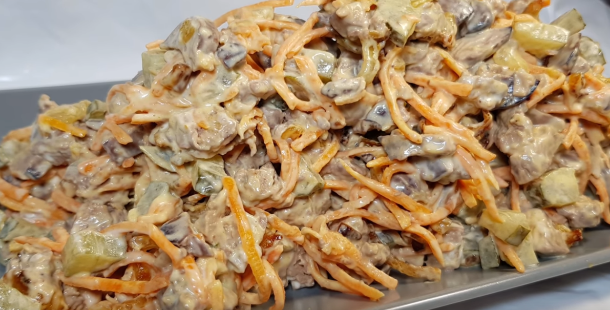 Печеночный салат это очень вкусное изысканное блюдо на любом столе. По этому простому рецепту вы приготовите его за считанные минуты, всего из четырех ингредиентов. Состав: - Куриная печень 400 граммов. - Лук репчатый 2 шт. - Морковь по-корейски 100 граммов. - Огурчики маринованные 2-3 шт. - Майонез. Куриную печень отвариваем в воде, слегка посолив, не более 15 минут. Далее мы нарезаем ее мелким кубиком и отправляем в отдельную глубокую емкость под салат. Две средние луковицы нарезаем произвольно и отправляем в раннее нагретую сковороду с небольшим количеством растительного масла. Добавляем по чайной ложке соли и сахара, и подрумяниваем лук на небольшом огне, периодически помешивая. В салатную емкость с печенью добавляем обжаренный лук и нарезанную корейскую морковь. Сюда же добавляем нарезанные мелкими кусочками огурчики, и заправляем столовой ложкой майонеза. Все перемешиваем и печеночный салат готов. Можете подавать на стол. Приятнейшего аппетита! На нашем сайте вы можете найти еще