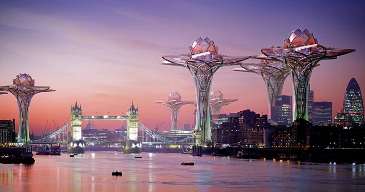 Строения похожи на гигантские распустившиеся цветы лотоса; это огромные сады, поднявшиеся высоко над небоскребами, практически над облаками.