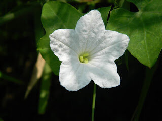 Листья плющевидной тыквы напоминают формой листья кавказского плюща. Цветки по форме напоминают воронку и окрашены в нежно белый цвет. Женские цветки мельче мужских, они обычно открываются первыми, а муж