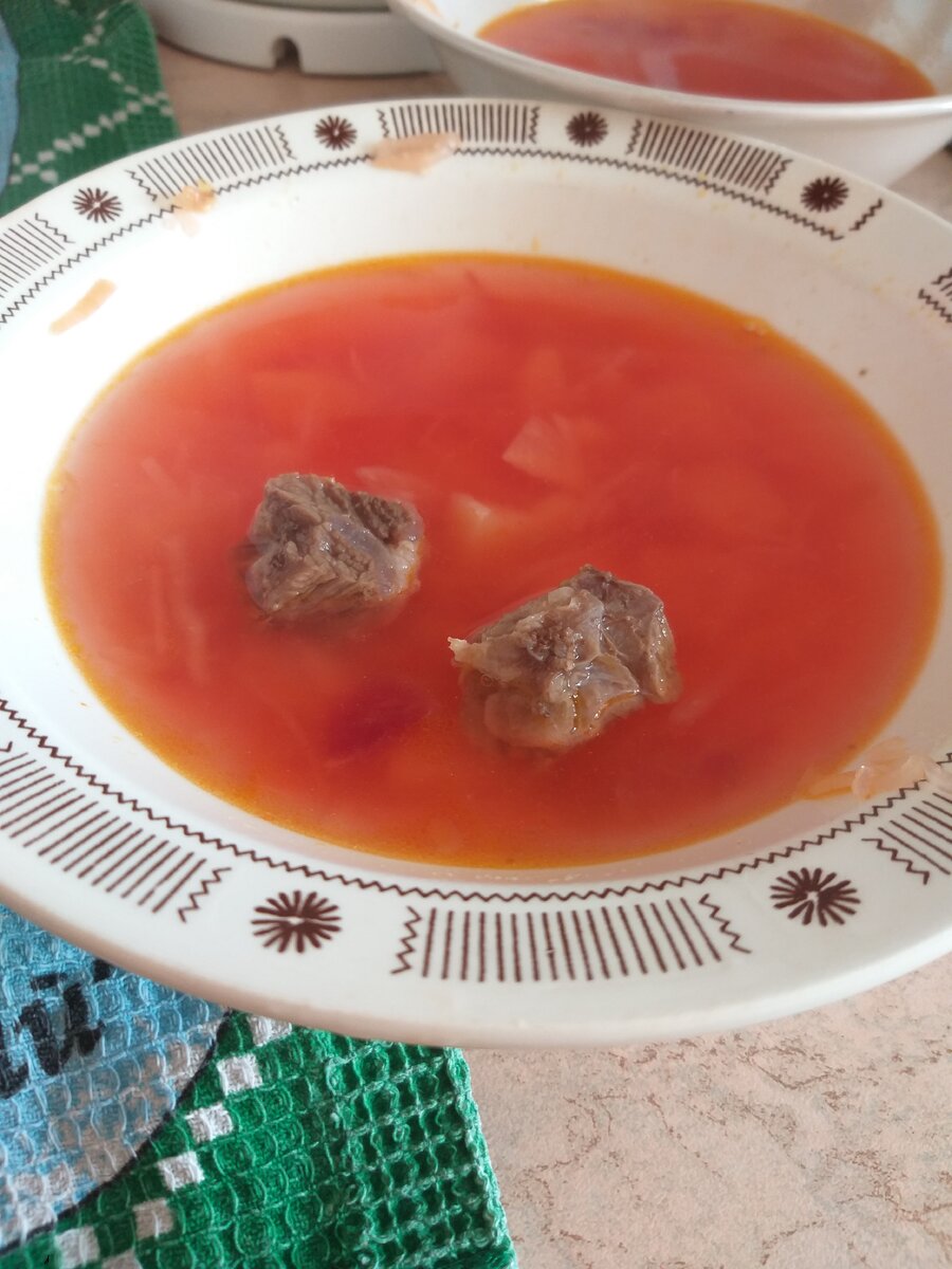 Нет человека который ни разу бы не пробовал это блюдо. Борщ не только вкусное и сытное блюдо, но и очень полезное. Этот суп может стоять неделю в холодильнике и останется столь же вкуссным как и в первый день, а некоторые говорят что он становится только вкуснее. Ингредиенты: Мясной бульон 2 литра Картофель 5 шт Капуста квашеная 150гр У меня уже готовая зажарка для борща(свекла, лук, морковь и томатная паста) Соль, перец горошком, лавровый лист. Рецепт: Для начала варим мясной бульон. Я обычно варю на говядине, точнее на ее ребрах. На 2 литра воды кладем 1-2 ребрышка, 1 лавровый лист, 3 горошенки перца и немного солим. Как только появляется бульон закипит, появится пена, ее нужно снять. И варить примерно 30 мин. За это время я обычно, чищу и режу картофель, шинкую свежую капусту или измельчаю квашеную. Далаю зажарку, но сегодня у меня уже готовая консервированная заправка, по рецепту мамы. Ею я обязательно поделюсь с вами в одном из следующих статей. А дальше все совсем просто, в
