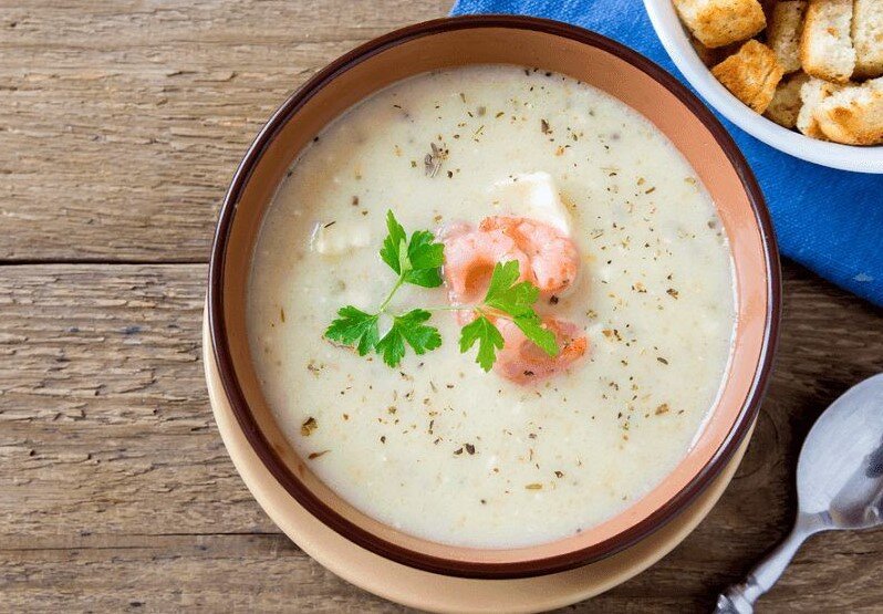 Этот суп с сыром и креветками покорил меня своим приятным сливочным вкусом с ароматом морепродуктов, поэтому хочу поделиться с Вами этим простым и вкусным рецептом. Итак, для приготовления сырного супа с креветками понадобятся: - сыр плавленый – 400 гр; - картошка – 200 гр; - морковь – 100 гр; - соль – 1 чайная ложка; - растительное масло – 40 мл; - сушеный молотый укроп – 30 гр; - сушеная молотая петрушка – 30 гр; - креветки замороженные очищенные – 200 гр. Расскажу по пунктам, как приготовить этот замечательный суп: 1. На сильный огонь поставить кастрюлю с водой. Для более густого супа налить 1,5 литра воды, а для менее густого – 2 литра. После закипания растворить в воде плавленый сыр. 2. Почистить и промыть картошку. Высушить ее бумажными полотенцами и измельчить кубиками размером 1-1,5 см, бросить в кастрюлю с повторно закипевшей водой и варить примерно 10-15 минут. 3. Морковь, как и картошку, почистить, промыть и высушить. Затем натереть ее на мелкой терке. 4. Разогреть на сковор