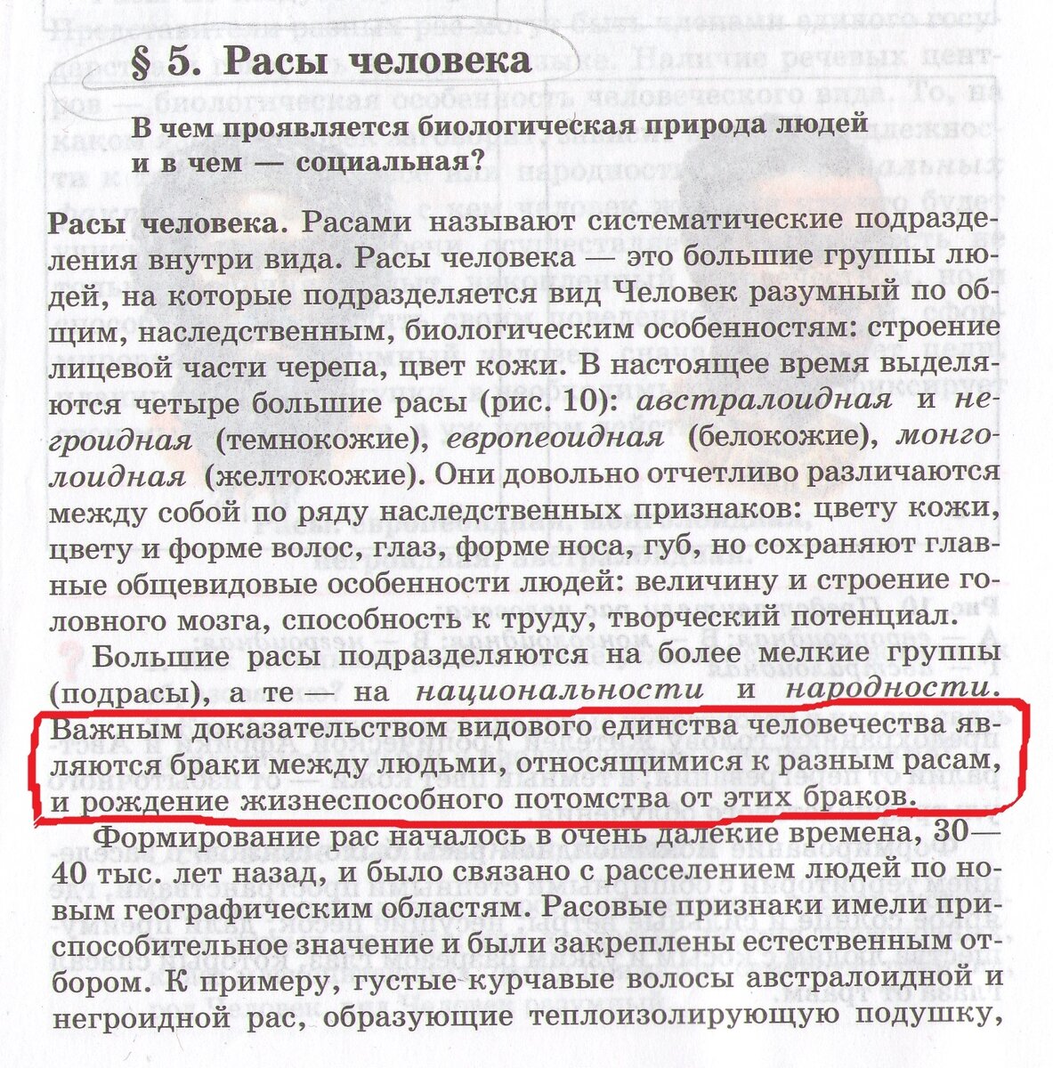 Читали осенью учебник 8 класса по биологии. И удивило следующее утверждение. Сразу оговорюсь, в семье биологов нет. Мне кажется, что данный довод слишком слаб даже для школьника. Многие школьники знают про гибриды среди животных: мулы, пизли (глоралы), хонорики, межняки (помесь тетерева и глухаря) и т.д. И слабость довода видна ещё ищущему основания жизни подростку, своё положение и идентификацию в мире. Это на мой взгляд вредно, т.к. может "работать" в обратную сторону, особенно если окружение ребёнка соответствующе националистически или расистски настроено. Если бы было написано, что "рождение плодовитого потомства" или "рождение потомства, способного к размножению", то куда ни шло. Или подразумевалось, что это входит в понятие "жизнеспособное"? Вряд ли. Получается, что довод из учебника подменяет собой более сильный аргумент... Признаюсь, что материал на следующей странице больше радует. Вскользь говорится и "об одном уровне эволюционного развития в биологическом и психическом отн