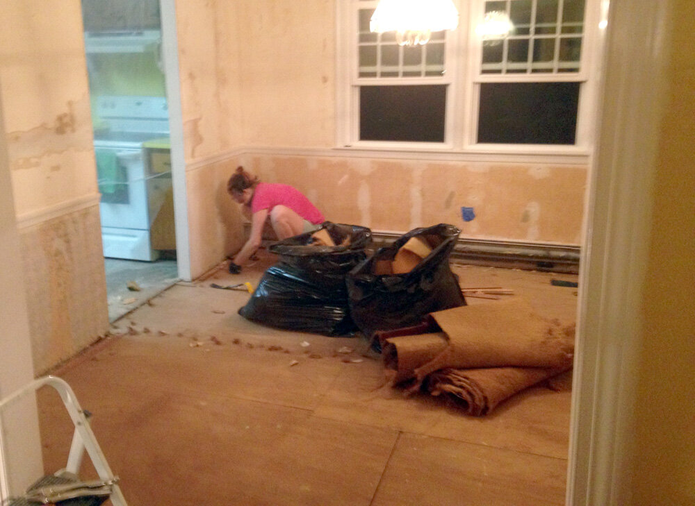 Поскольку с обоями манипуляции заняли много времени, было решено разделиться. Один из помощников занялся снятием ковролина. Старое розовое покрытие давно требовало замены, поскольку собирало много пыли, да и вид имело далеко не самый эстетичный.