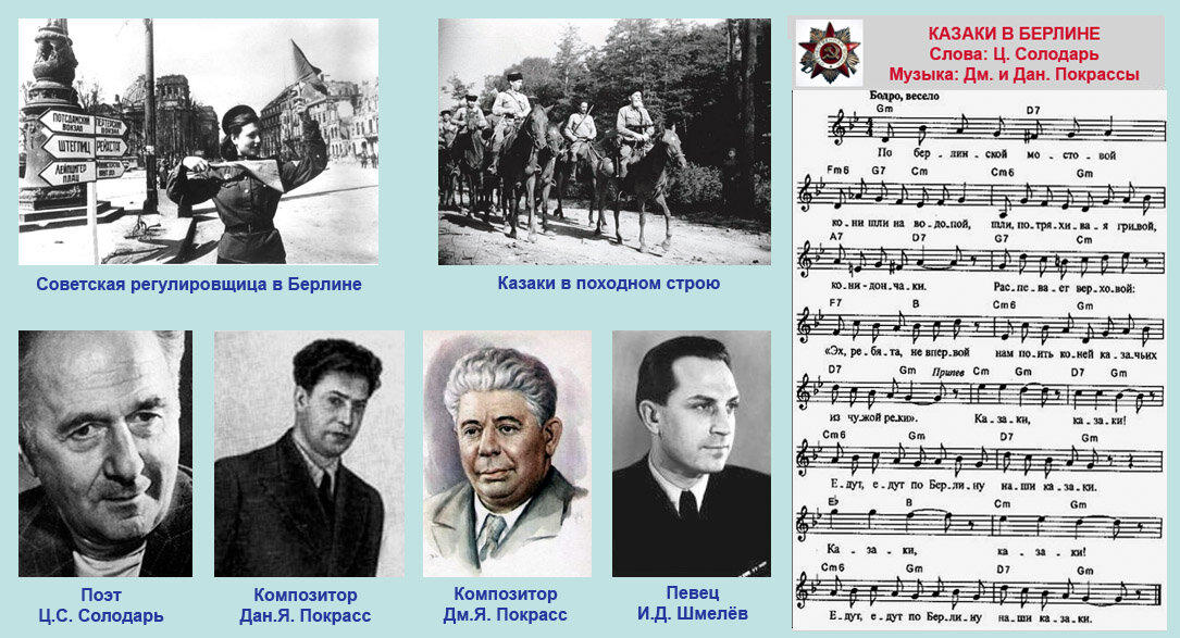 Песня «Казаки в Берлине» – первая, рождённая в мирный день, в день Великой Победы 9 мая 1945 года! Она как бы завершила долгий и трудный путь, начатый в те суровые дни, когда впервые прозвучала «Священная война», звавшая на смертный бой с фашизмом, бой, закончившийся в столице поверженной гитлеровской Германии Берлине.